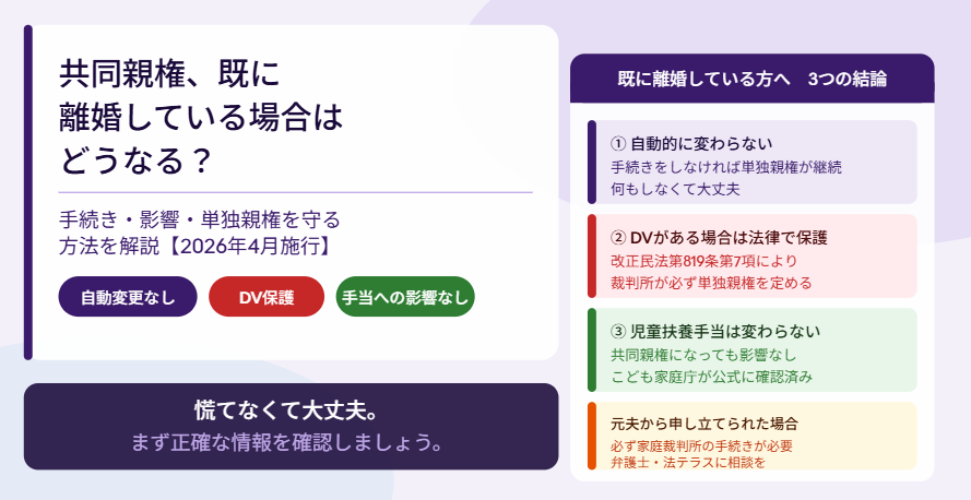 「共同親権が始まったけど、もう離婚している自分はどうなるの?」「自動的に共同親権に変わるの?」——2026年4月の改正民法施行を受けて、こんな不安を感じている離婚済みのシングルマザーは多いと思います。結論から先にお伝えします。既に離婚している場... -