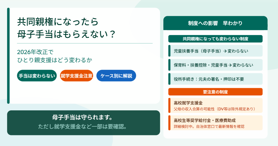 「共同親権になったら、母子手当(児童扶養手当)はもらえなくなるの?」——2026年4月の改正民法施行をきっかけに、こうした不安を持つシングルマザーが増えています。結論から言えば、共同親権になっても児童扶養手当(母子手当)は引き続き受給できます。... -