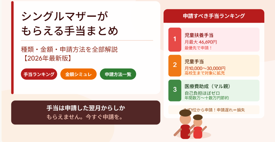 シングルマザーがもらえる手当まとめ【2026年最新】種類・金額・申請方法を全部解説